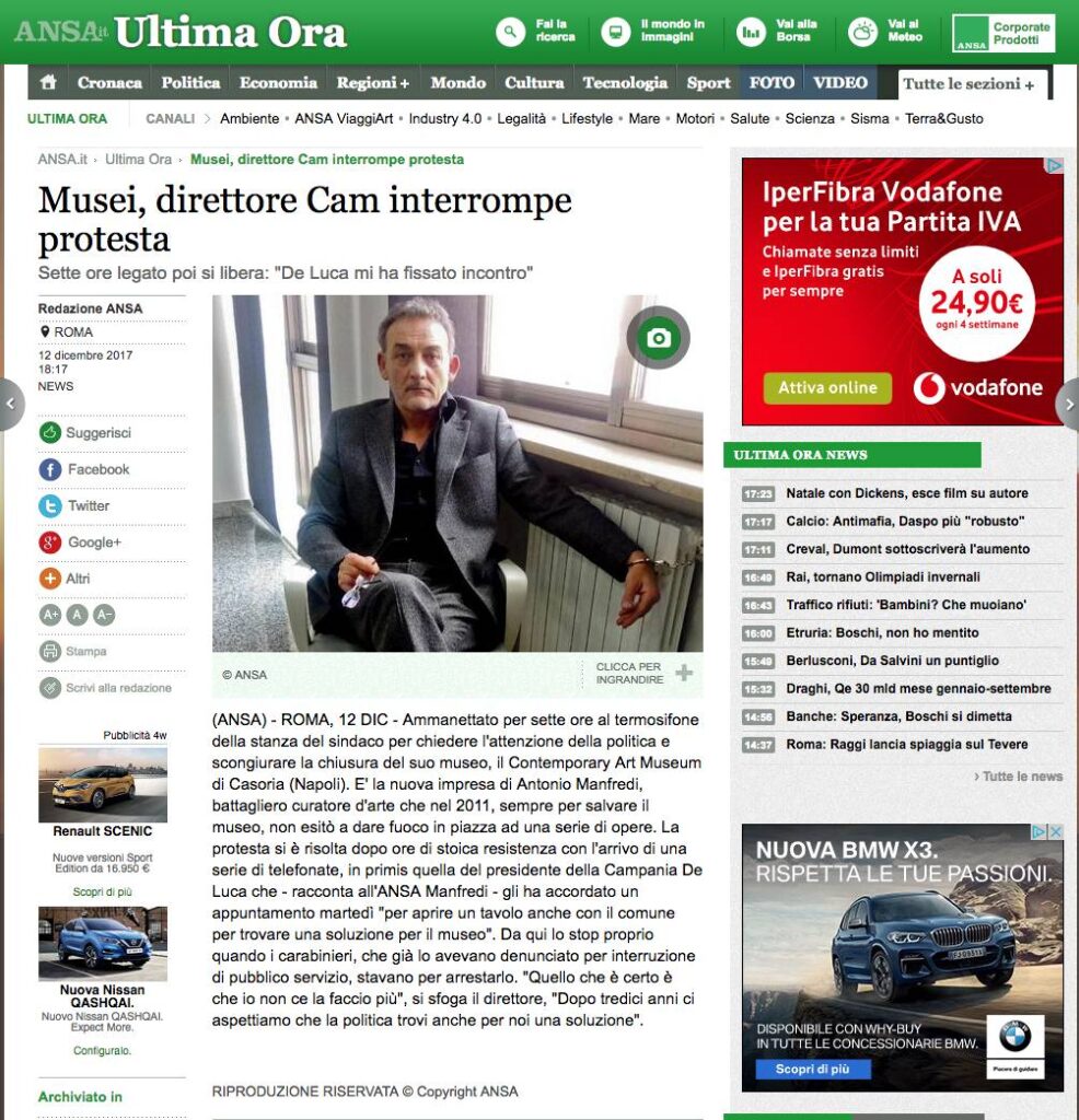 “I’m Antonio Manfredi, director of the CAM Museum in Casoria, I just handcuffed my self in the office of the Mayor of Casoria Pasquale Fuccio who has promised countless funding for the museum but has never kept what was declared in his official visits to the CAM.