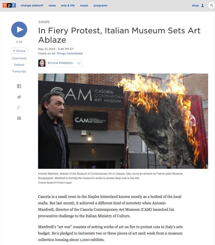 Something odd is happening at the Casoria Contemporary Art Museum (CAM), near Naples. Some paintings and sculptures are being torched. Great art has felt the lick of flames before, but often by ransacking or accident. Here, for more than a week, the director of the gallery has been the one setting the artworks alight. read more
